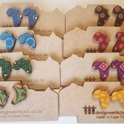 Ihastuttavat ja upean värikkäät Shwe shwe -kankaalla kuvioidut Afrikka-korvakorut valmistetaan Kapkaupungissa, Etelä-Afrikassa.