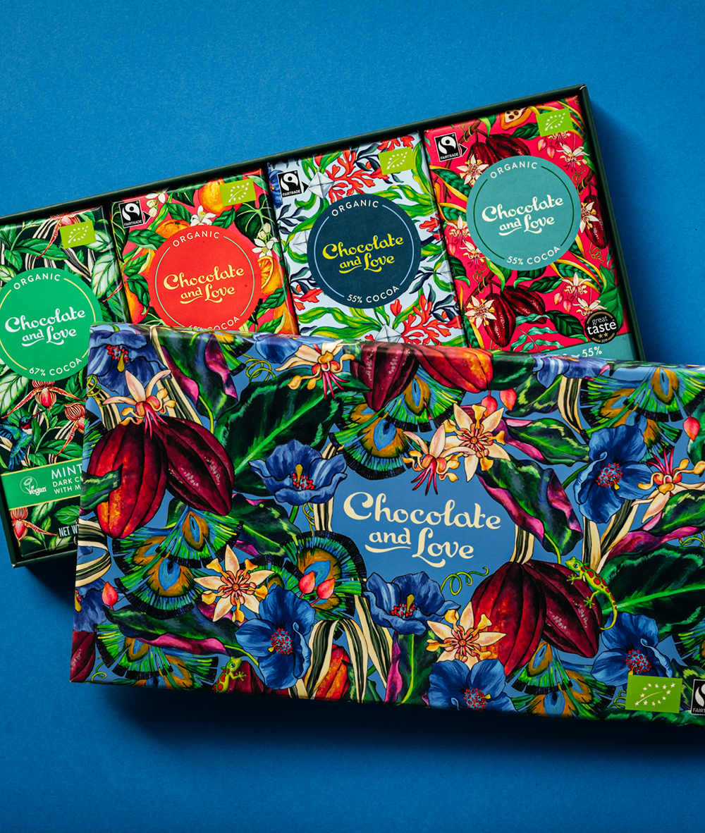 Tinkimättömästi luomuraaka-aineista Reilun kaupan periaatteiden mukaisesti valmistetut, henkeäsalpaavan kauniit Chocolate and Love suklaat ovat juhla kaikille ja aisteille ja omalletunnolle.