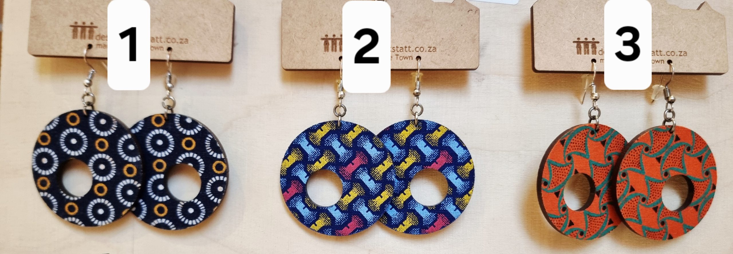 Ihastuttavat ja upean värikkäät Shweshwe -kankaalla kuvioidut korvakorut valmistetaan Kapkaupungissa, Etelä-Afrikassa. Korut tehdään käsityönä ja jokainen koru on uniikki.